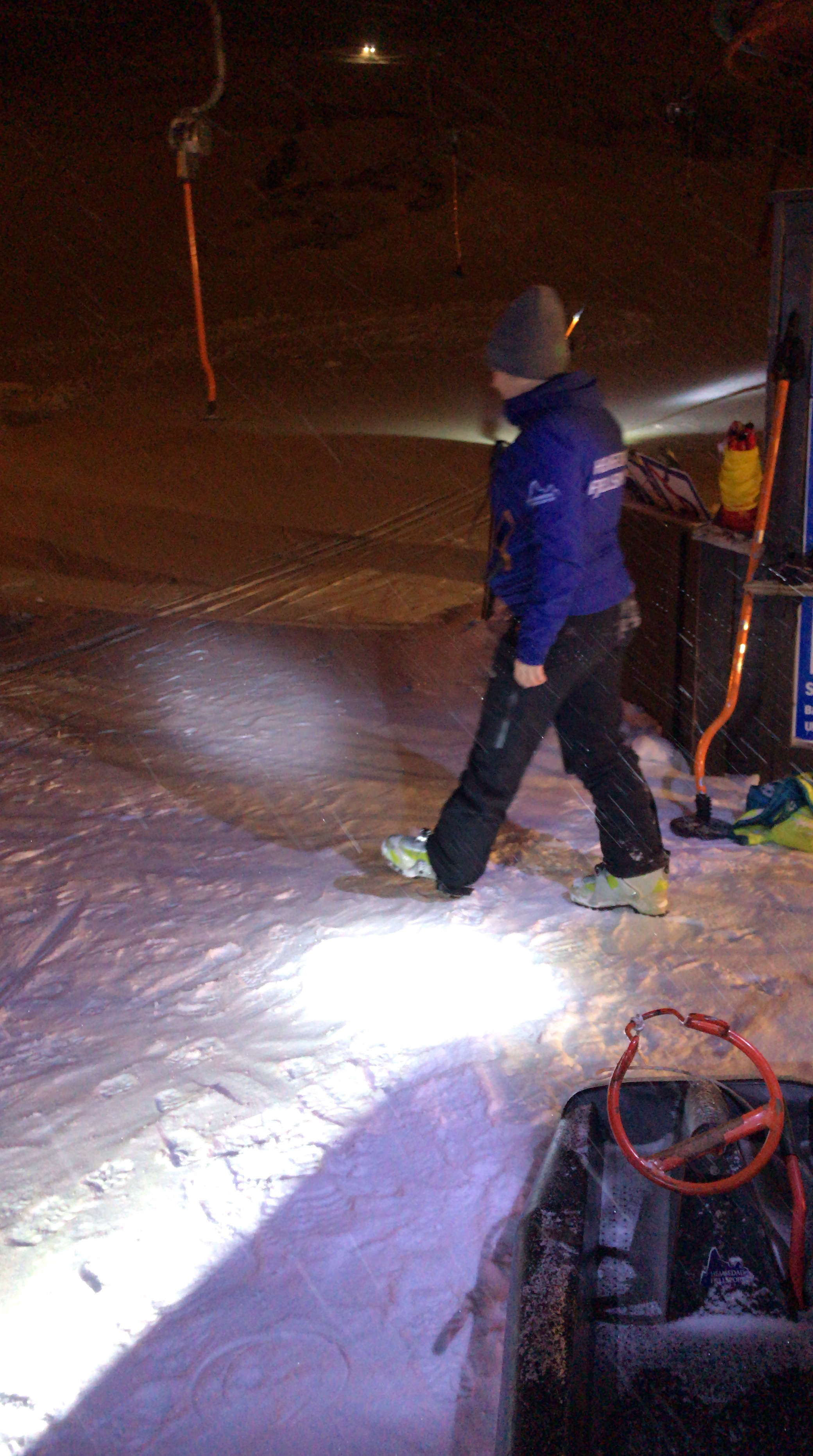 Etter å ha tatt hollvin express opp blir vi møtt av en veldig hyggelig dame som jeg ikke fikk navnet på. Her fikk vi utdelt hodelykter, og litt hjelp med å sette de på, og utdelt kjelke vi skulle kjøre med. Når alle hadde fått på hodelykt og hjelm var vi klare for å komme oss opp til toppen av slalombakken.