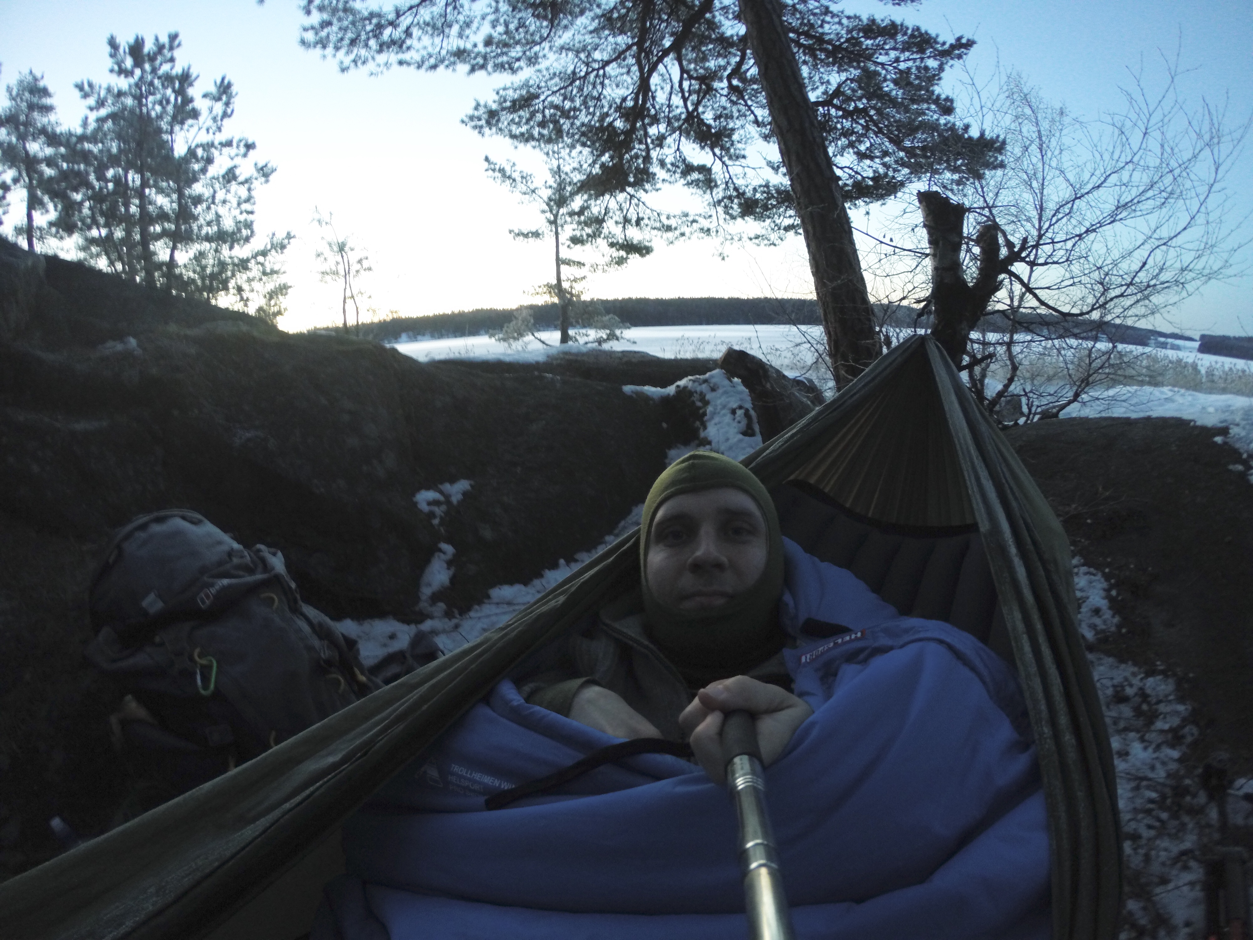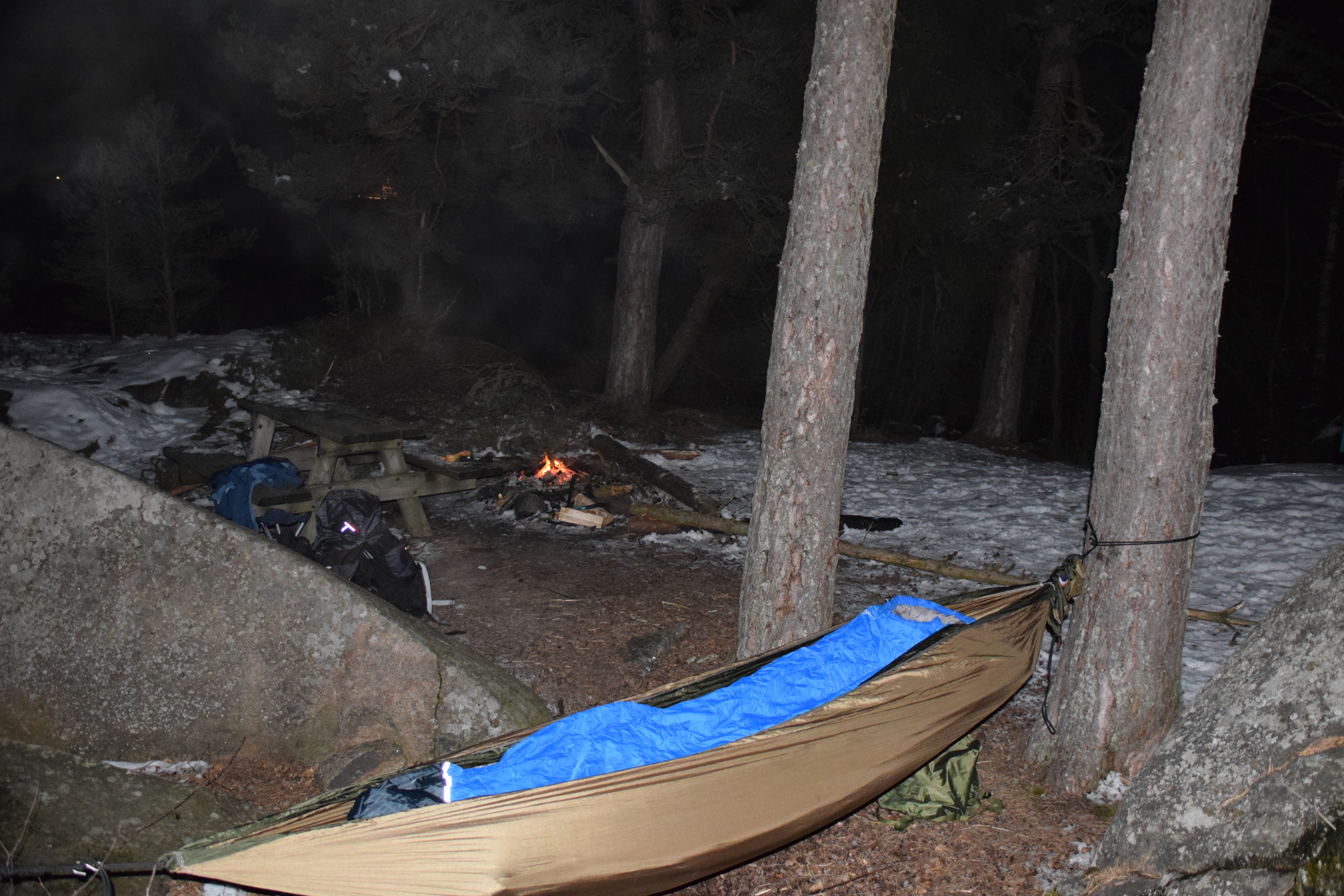 En fantastisk følelse kom til meg mens jeg gikk. Det var en sånn behagelig stillhet mens jeg gikk. Stjernene hadde begynt å komme frem, det var mørkt. Det var bare jeg, naturen og lyset fra hodelykten. Når jeg kom frem fyrte jeg opp et bål (bål må man alltid ha) og begynte å sanke mer ved før jeg så etter et sted å henge køya for natten. Jeg fant raskt et perfekt sted nesten rett ved siden av bålplassen. Her ville jeg ligge i le hvis det skulle begynne å blåse og i tillegg hadde jeg utsikt mot vannet og retning av der sola står opp. Så jeg hang opp køya, la klart alt jeg skulle ha oppi køya. Ble skumunderlag, oppblåsbart underlag, teppe og sovepose med lakenpose inni.