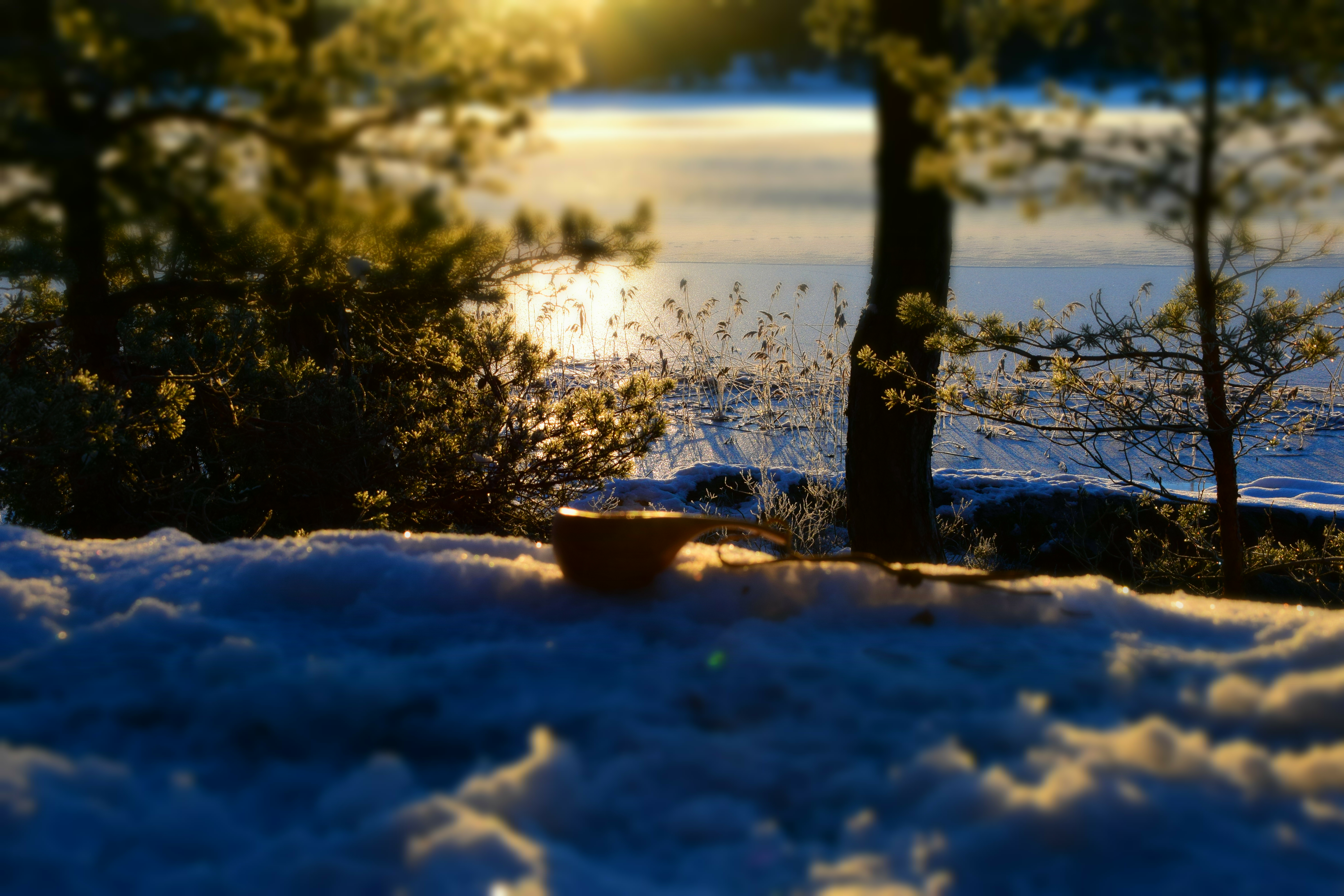 Ca. kl 06 var natten over for min del, og jeg var våken. Sovepose og alle tingene rundt meg var dekket av frostrim etter en kald natt med temperatur på ned mot 11 blå. Heldigvis hadde jeg tatt mine forholdsregler når det gjaldt soveplassen, og med min deilige og varme sovepose var jeg aldri kald (Jeg har skrevet om soveposene vi bruker tidligere, de kan du lese om her: https://friluftsmor.no/2019/02/10/soveposer/ ). Det hadde begynt å lysne på denne tiden, men solen hadde enda ikke kommet over kanten på åsen i øst. Siden jeg hadde lagt alt til rette kvelden før, kunne jeg nå lage meg kaffe på stormkjøkkenet mens jeg lå i køya. Dette var helt fantastisk. Når kaffen hadde trekt ferdig, kom sola listene over åsen, og jeg lå der fortsatt i posen, nøt en deilig kopp kaffe, frokost og så på den nydelige soloppgangen. For en fantastisk start på uka.