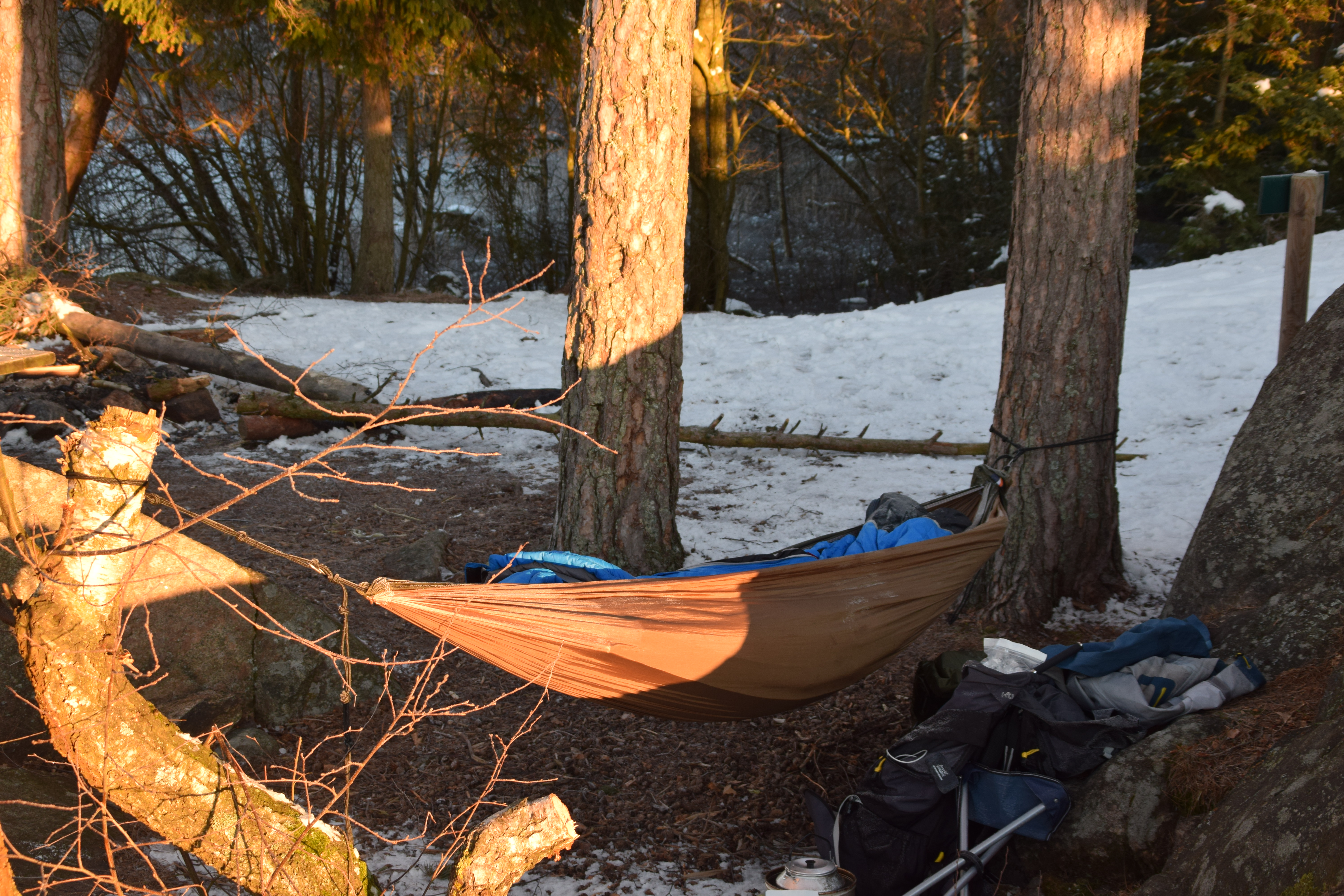 Jeg hadde lest og fått noen tips om hva jeg burde ha med når jeg skal på hengekøyetur, og på vintertur. Med tanke på at det var meldt en den kuldegrader på natten pakket jeg med det jeg trodde jeg trengte for å ligge godt i hengekøyen, samt ikke fryse. Jeg pakket derfor hengekøye (ticket to the moon dobbel) Bergans xtreme skumliggeunderlag, exped downmat 7 LW og et ullpledd. Jeg pakket i tillegg med et ekstra ulltøy sett og ekstra sokker (dette var helt overflødig). Av andre ting jeg hadde med var stormkjøkken, kamera, kamerastativ, noe mat og drikke, en liten krakk/stol, kniv, sag og øks, hodelykt, sovepose og sikkert noen ting til jeg har glemt i farten. jeg fylte ihvertfall sekken på 65L.