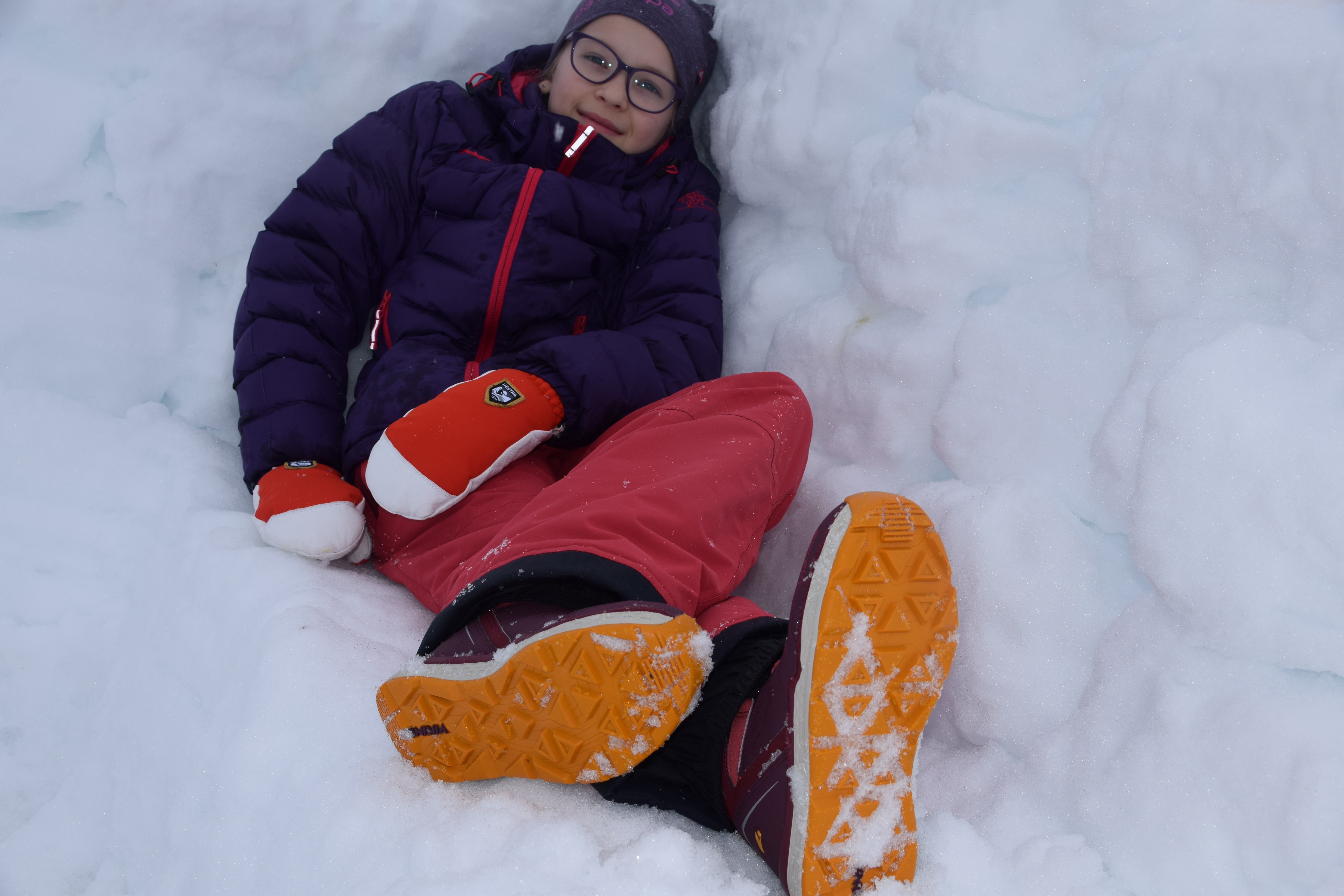 Skoen kom i posten i akkurat rette øyeblikk for å bli med på vinterferie, noe som resulterte i at vi fikk testet skoen i ordentlig vintervær, slik den er laget for. Vi var alle spente når vi fikk skoen i posten. så den ut som den vi hadde sett på bilde? Var størrelsen riktig og ville den passe til Hanna sin fot. Skoen passet akkurat som den skulle og Hanna syns skoene så stillig ut. Førsteinntrykket til oss voksne var at de så solide ut, kjentes varme og behagelige og at de var fine å se på.