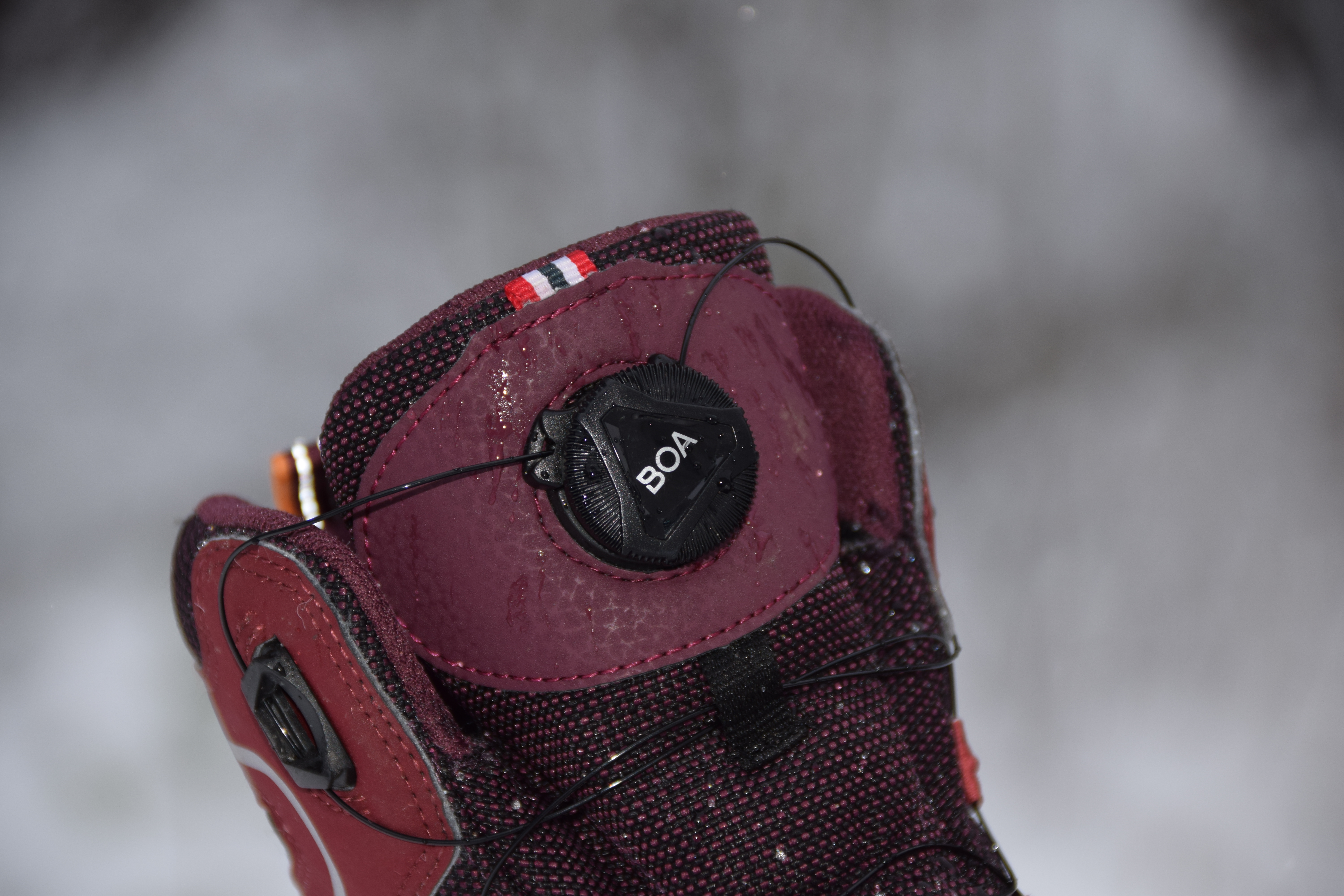 Skoene er laget med Boa lukking. det vil si bare et hjul man skrur på for å lukke skoen, istedenfor vanlig snøring. Dette er ett velkjent system og fungerer veldig godt på disse skoene. Hanna opplever at hun får strammet skoene godt og at det er lett å lukke de selv. Eneste hun hadde å utsette på lukkingen er at selve hjulet som hun skrur på er noe skarpt mot fingrene når hun strammer til ordentlig. Her hadde det nok vært bedre med litt gummi rundt, slik at lukkingen hadde vært mer behagelig.