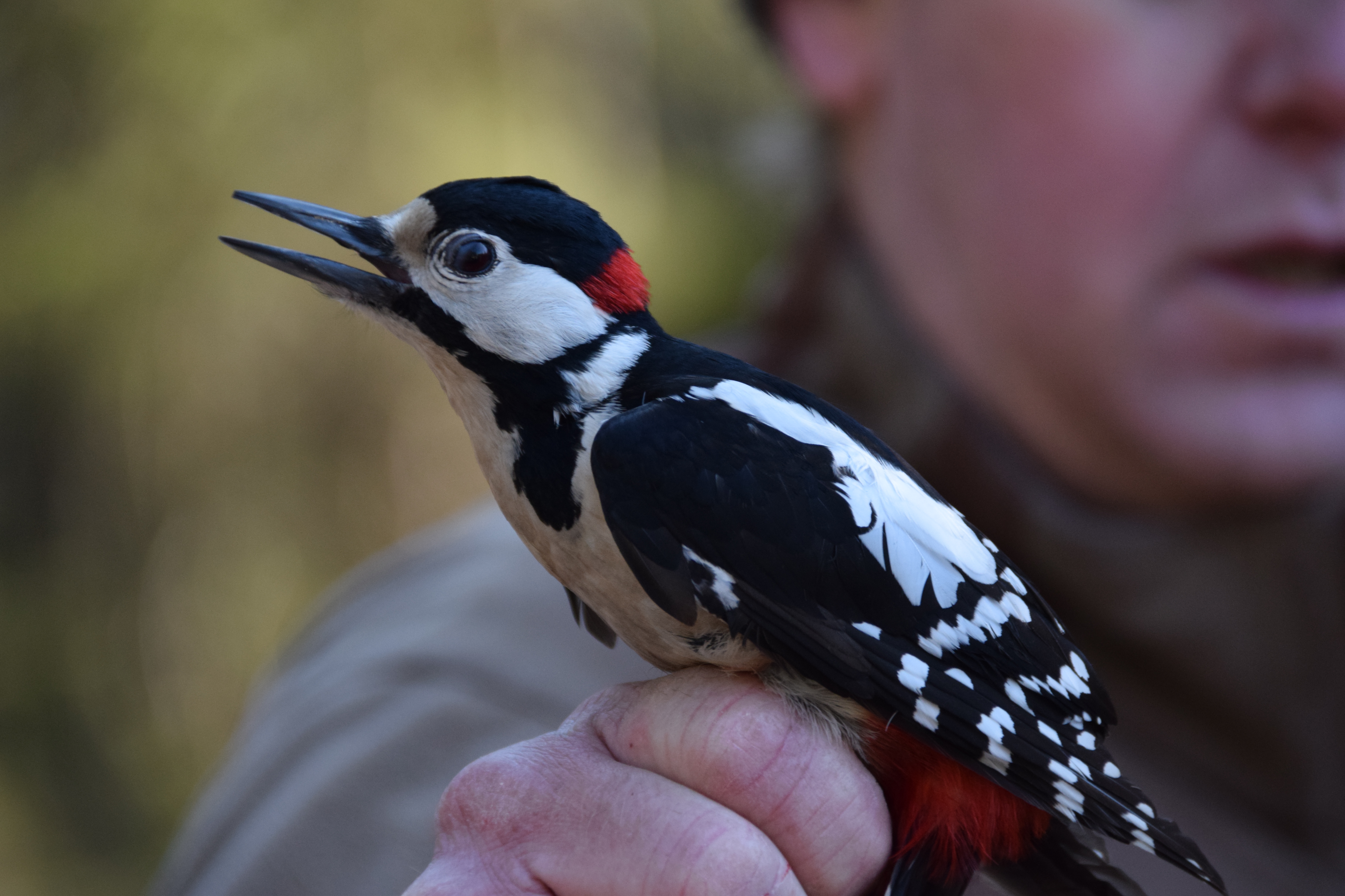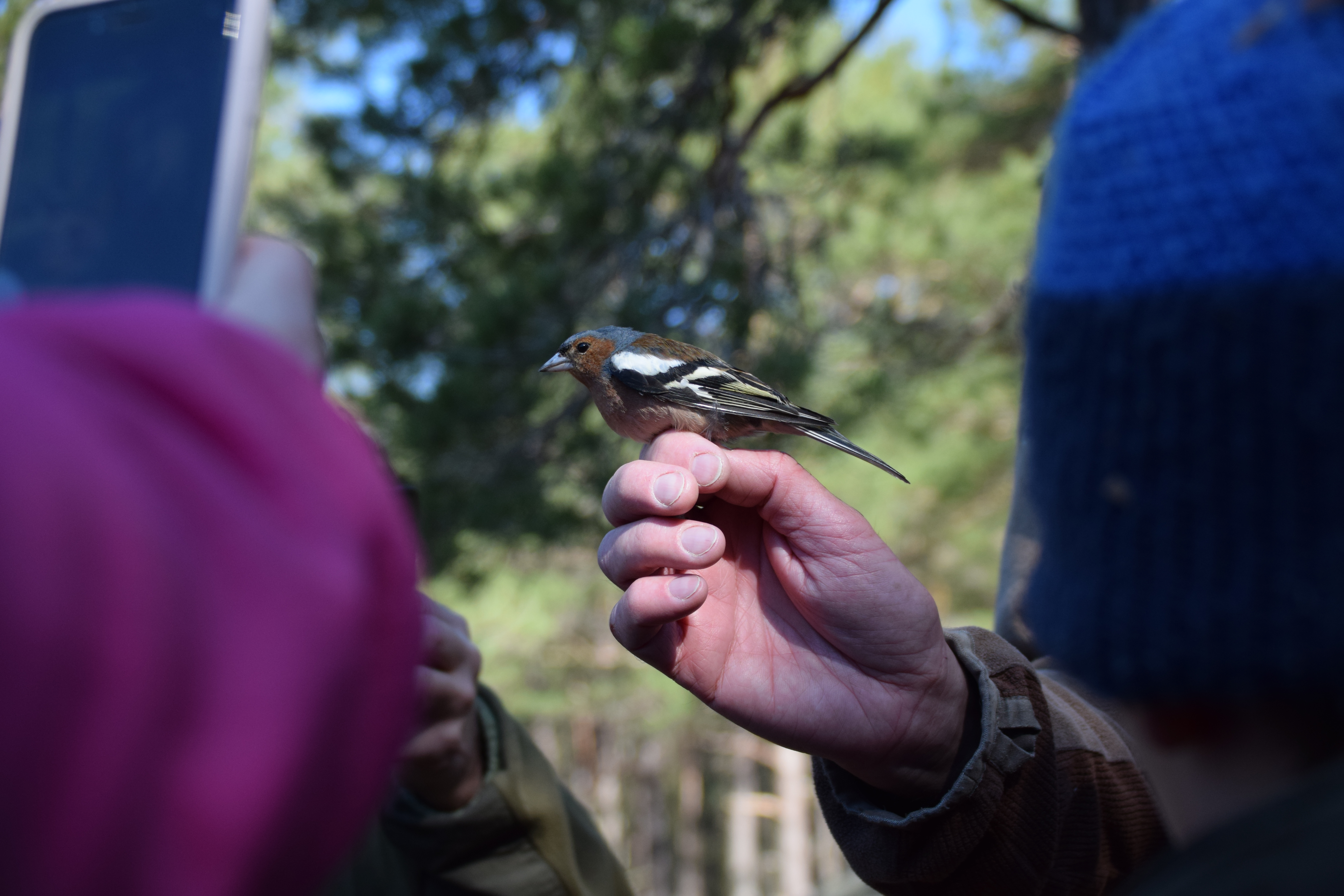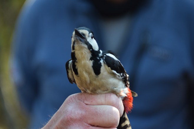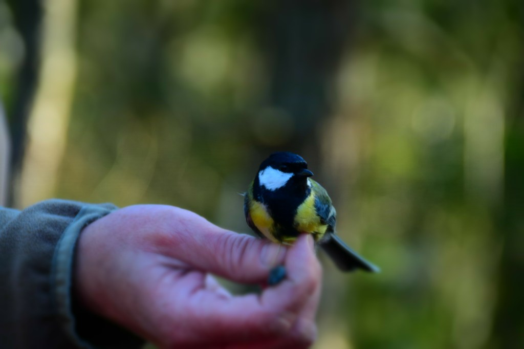 Når Knut hadde merket en fugl, fikk alle som hadde lyst kjenne forsiktig på fuglen, for å kjenne hvordan den kjentes ut. Flere av små fuglene har en kroppstemperatur på ca 40 grader, og de var ganske myke og varme å kjenne på. Når alle som hadde lyst til å klappe fuglen, var det tid for å slippe den løs igjen, da fikk de av barna som hadde lyst lov til å holde den forsiktig og slippe den løs. Dette var stor stas for mange av barna, og Hanna var heldig og fikk holde og slippe løs 2 fugler. En kjøttmeis og en blå meis. Disse fuglene var kjent for å klype med nebbet, men Hanna slapp heldigvis unna dette.